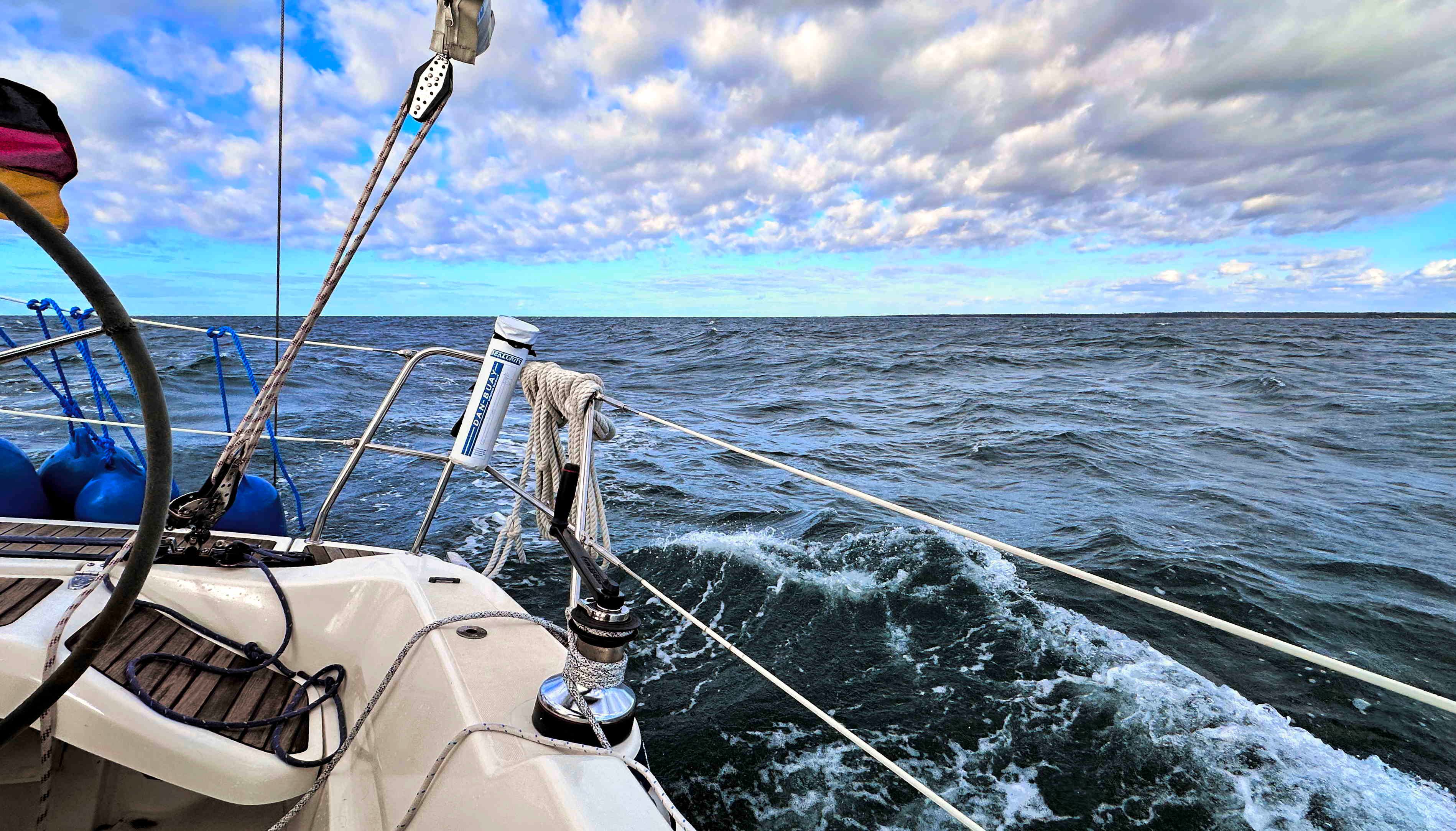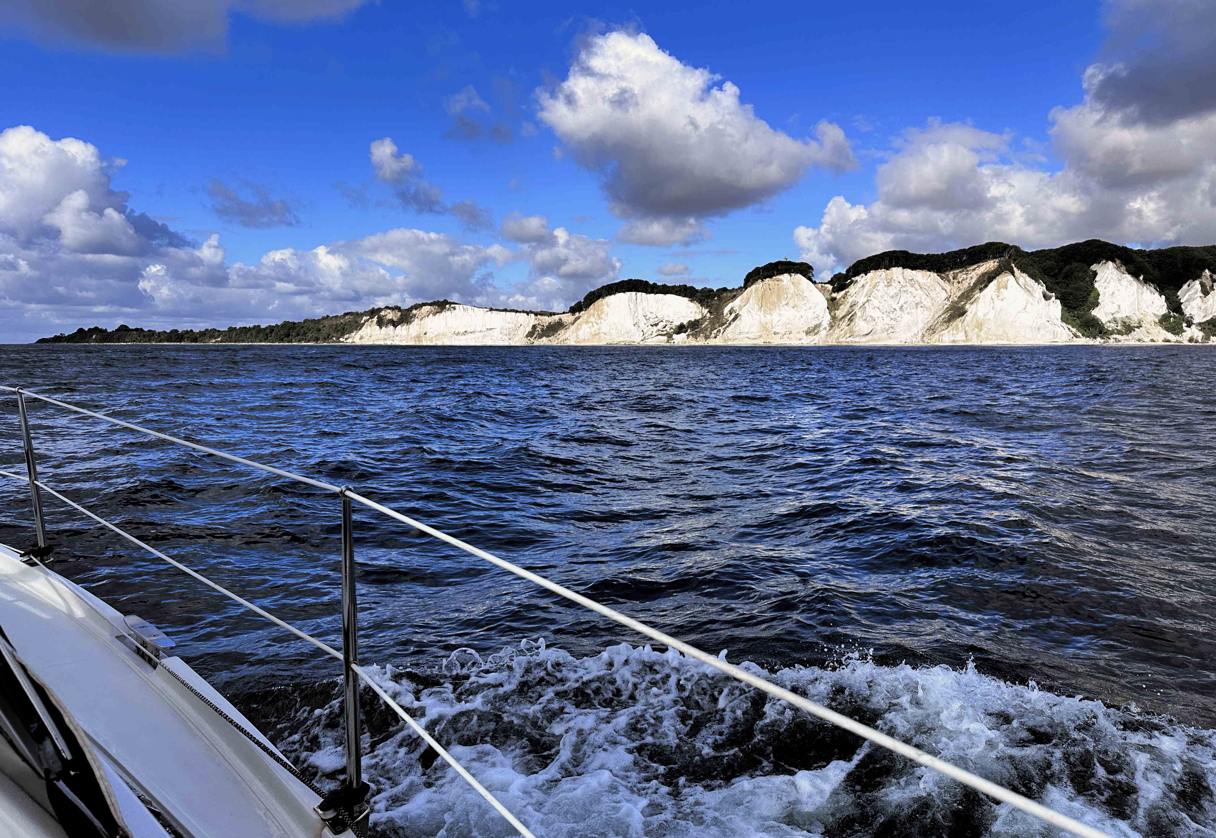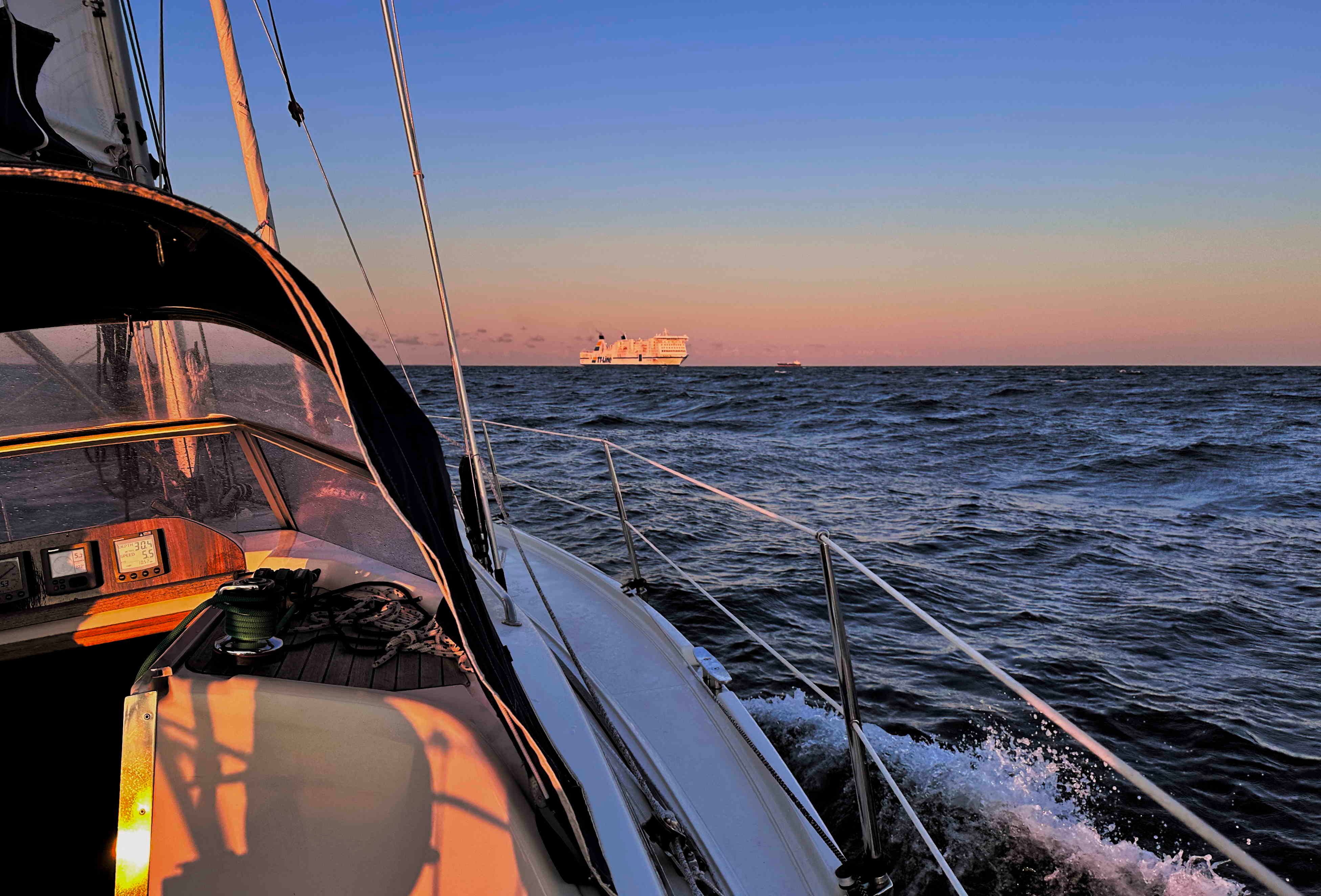 Das Barometer steigt, der Himmel ist blau und SY Blue Layla scheint Spaß zu haben an den letzten 100 sportlichen Seemeilen über die Arkonasee, die diesmal ihre Zähne hin und wieder zeigen darf: Bis Klintholm (s.o.) haben wir 15-23kn Wind gegenan; am nächsten Tag nehmen Wind und Welle noch zu, aber wir können dafür größtenteils einen Halbwindkurs anlegen – wenn uns nicht die Ausweichmanöver angesichts der dicken Pötte in der Kadetrinne (s.u.) noch Höhe kosten würden.