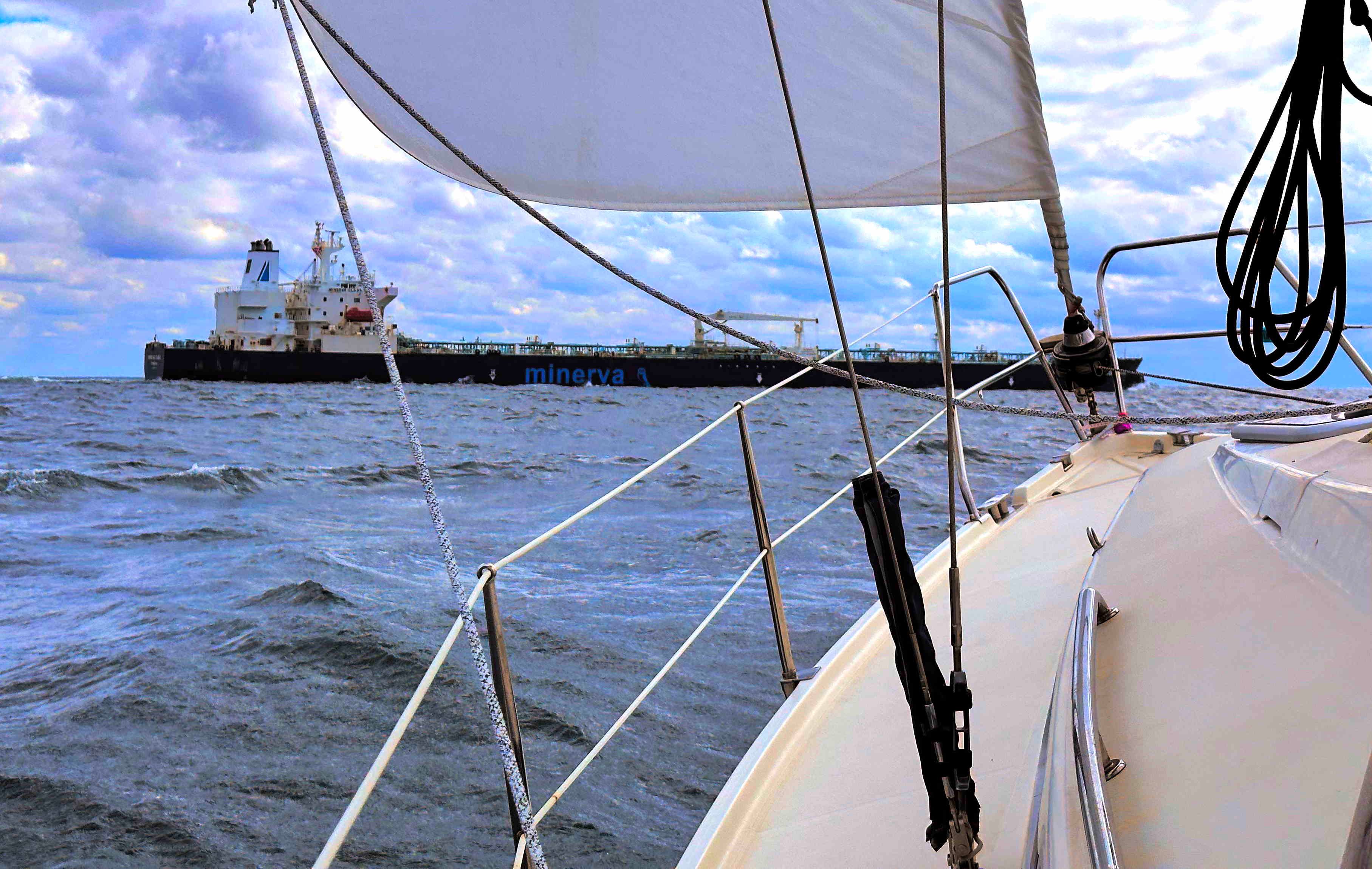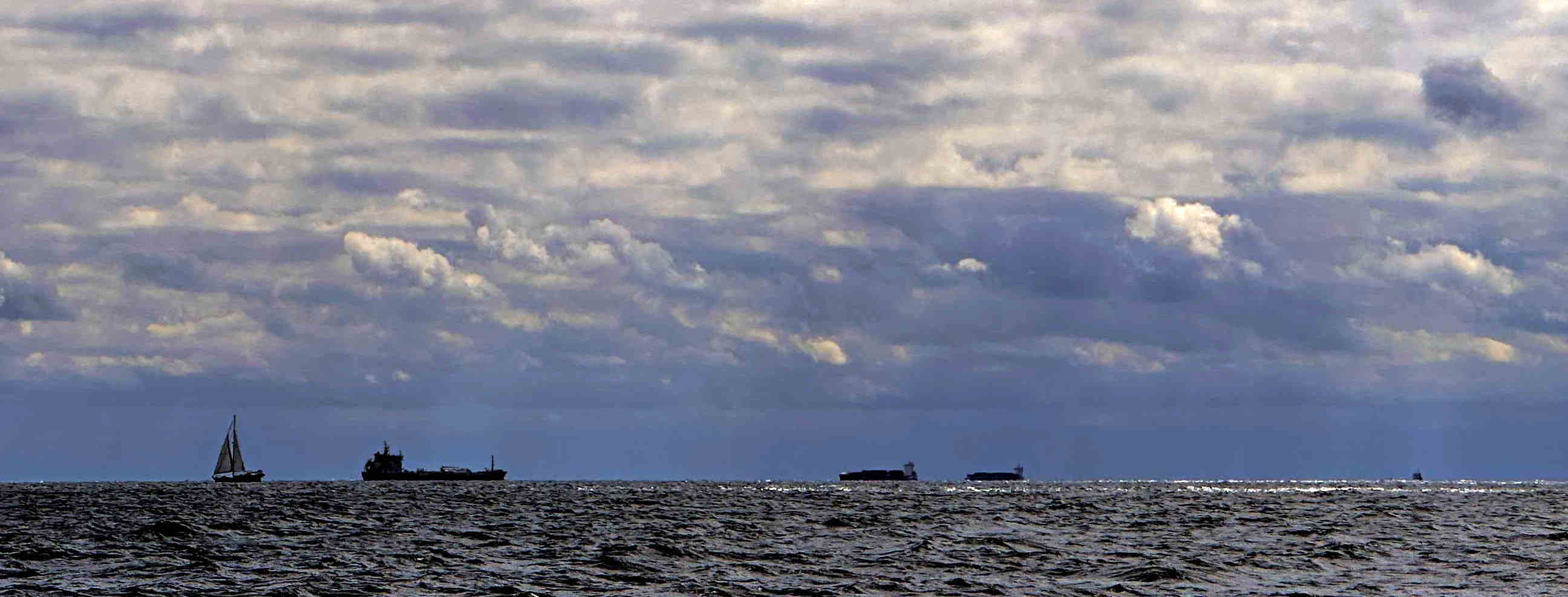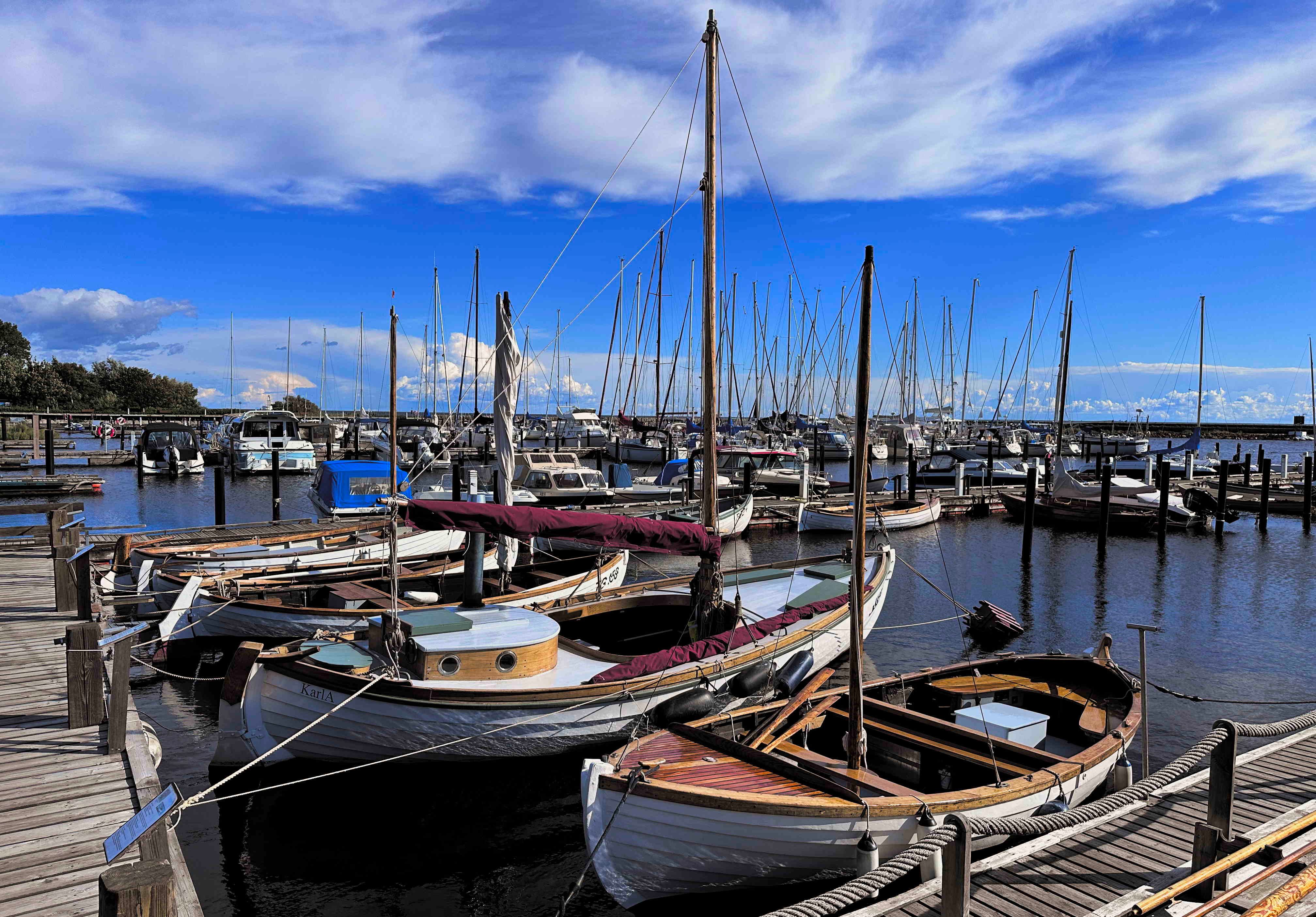 Das Barometer steigt, der Himmel ist blau und SY Blue Layla scheint Spaß zu haben an den letzten 100 sportlichen Seemeilen über die Arkonasee, die diesmal ihre Zähne hin und wieder zeigen darf: Bis Klintholm (s.o.) haben wir 15-23kn Wind gegenan; am nächsten Tag nehmen Wind und Welle noch zu, aber wir können dafür größtenteils einen Halbwindkurs anlegen – wenn uns nicht die Ausweichmanöver angesichts der dicken Pötte in der Kadetrinne (s.u.) noch Höhe kosten würden.