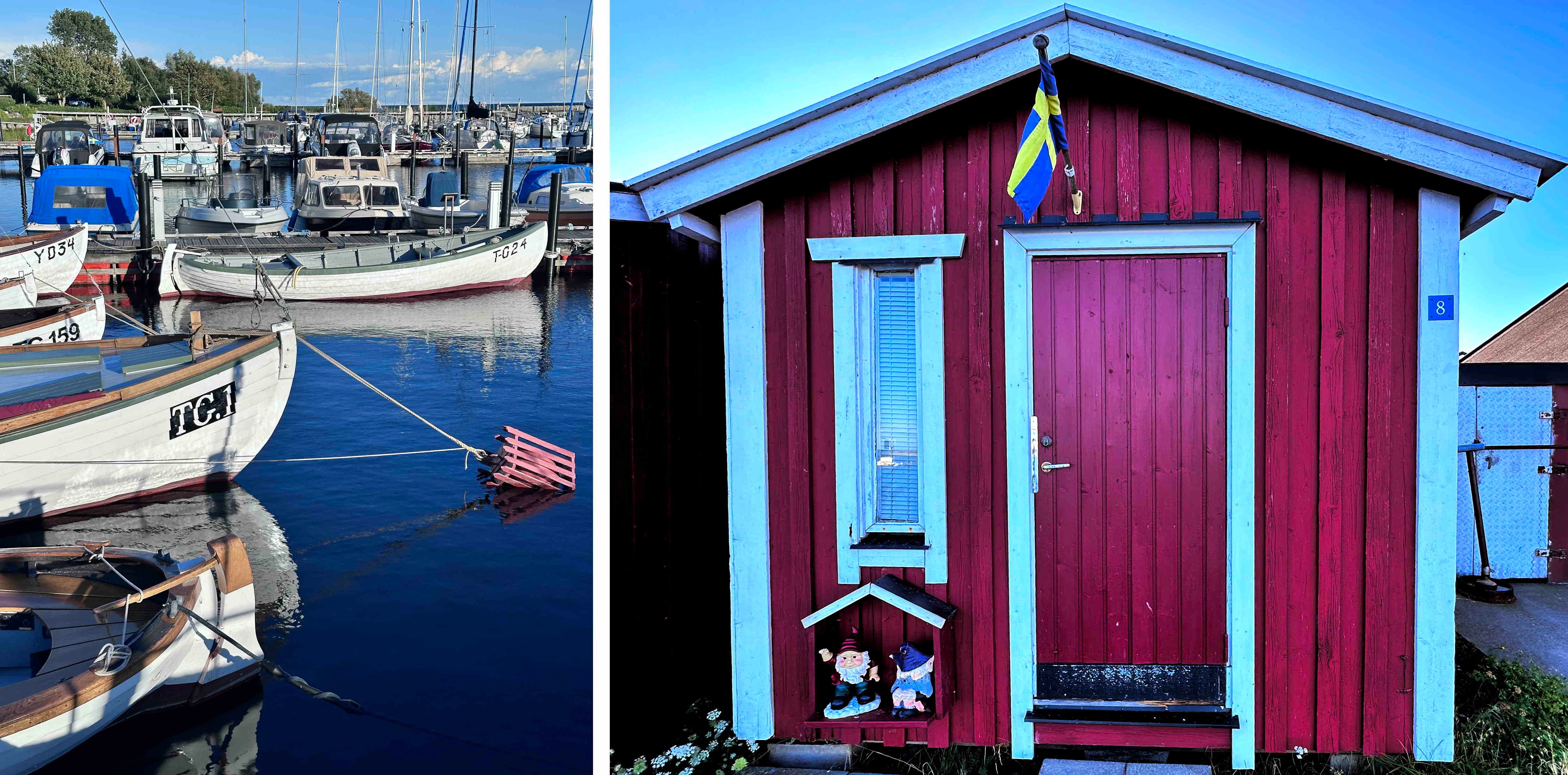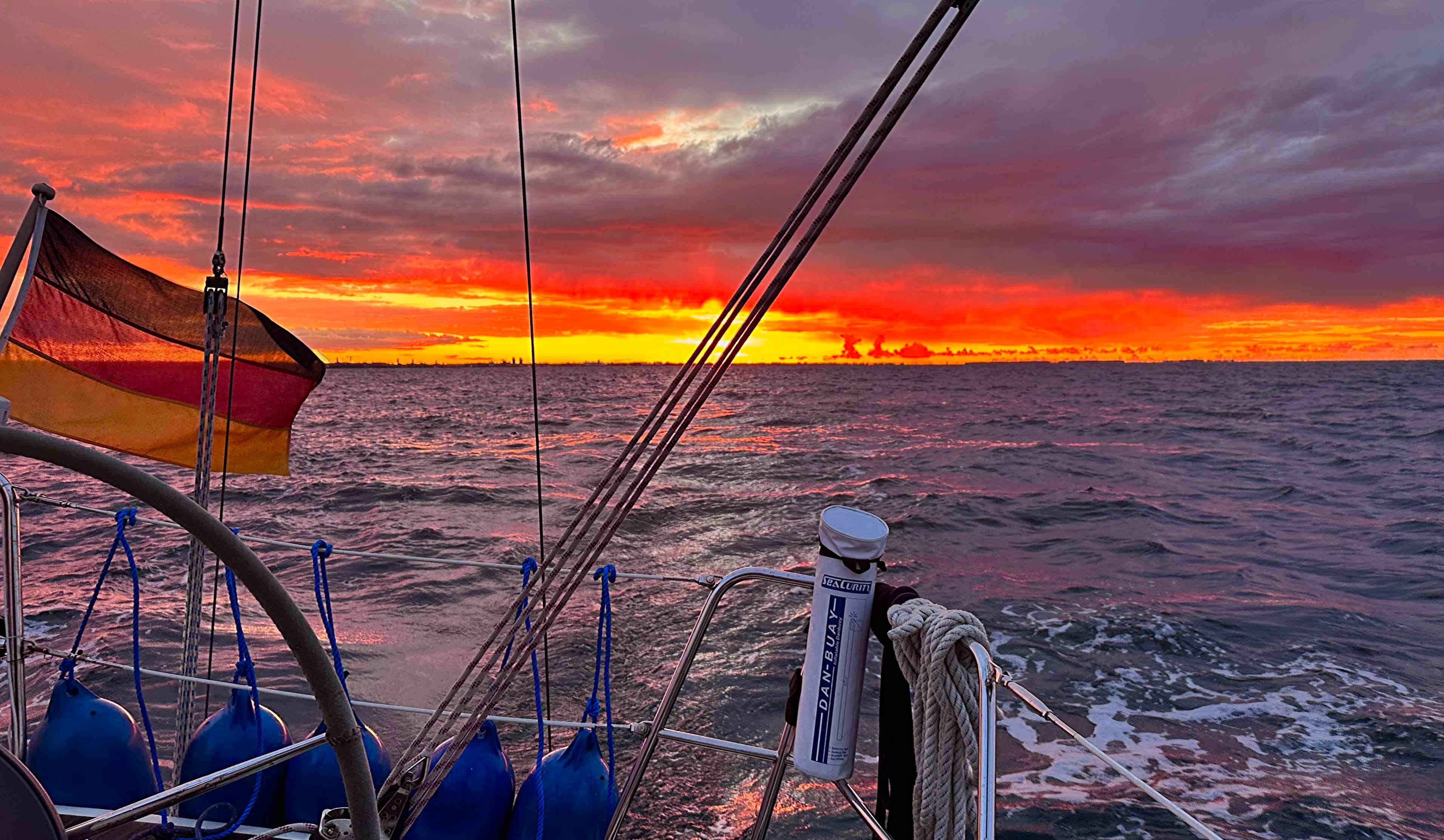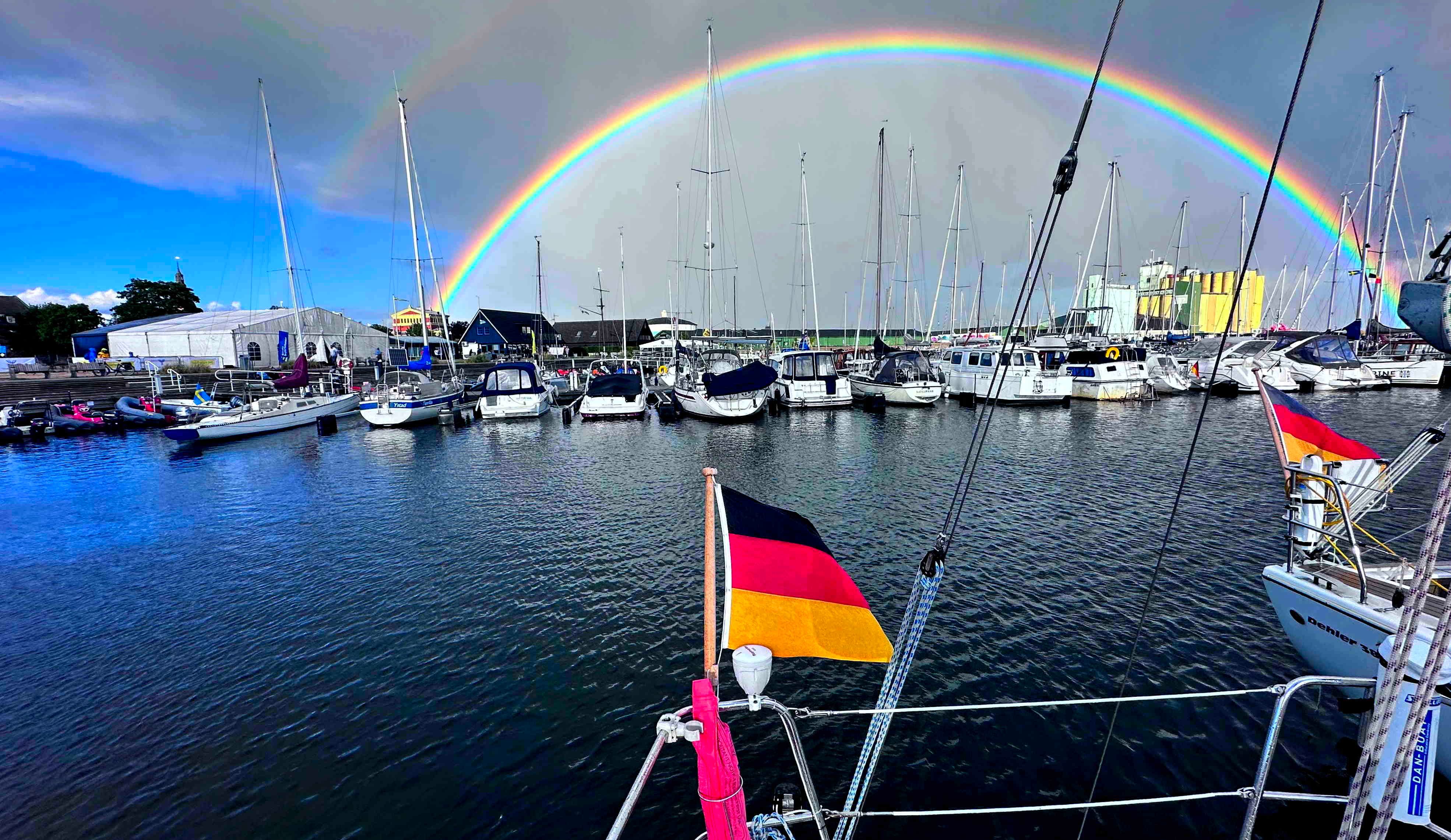 „Red sky at night, sailors’ delight. Red sky at morning, sailors take warning.“: Nach einem regnerischen, stürmischen und grauen Hafenabend dürfen wir wieder einmal einen wunderbaren Segelmorgen auf einer blutrotkitschig erleuchteten See verbringen (s.o.) und nehmen die eingangs zitierte Variante des Bibelspruchs (Mt 16,2f.) zum Anlass, es bei einem 5-Stunden-Schlag nach Gislövs Läge/Trelleborg (s.u.) bewenden zu lassen. Und tatsächlich donnert dort nur wenige Minuten nach unserer Ankunft der Regen aufs Deck und 26kn-Böen pfeifen durchs Rigg. Das gibt uns aber vor allem die Gelegenheit, Freunde aus Malmö zu treffen, die uns zu einer Nachmittagsfika auf SY Blue Layla besuchen und über den in diesen Tagen in den Verkehr gebrachten 2025er Surströmming (s. u.) fachsimpeln.