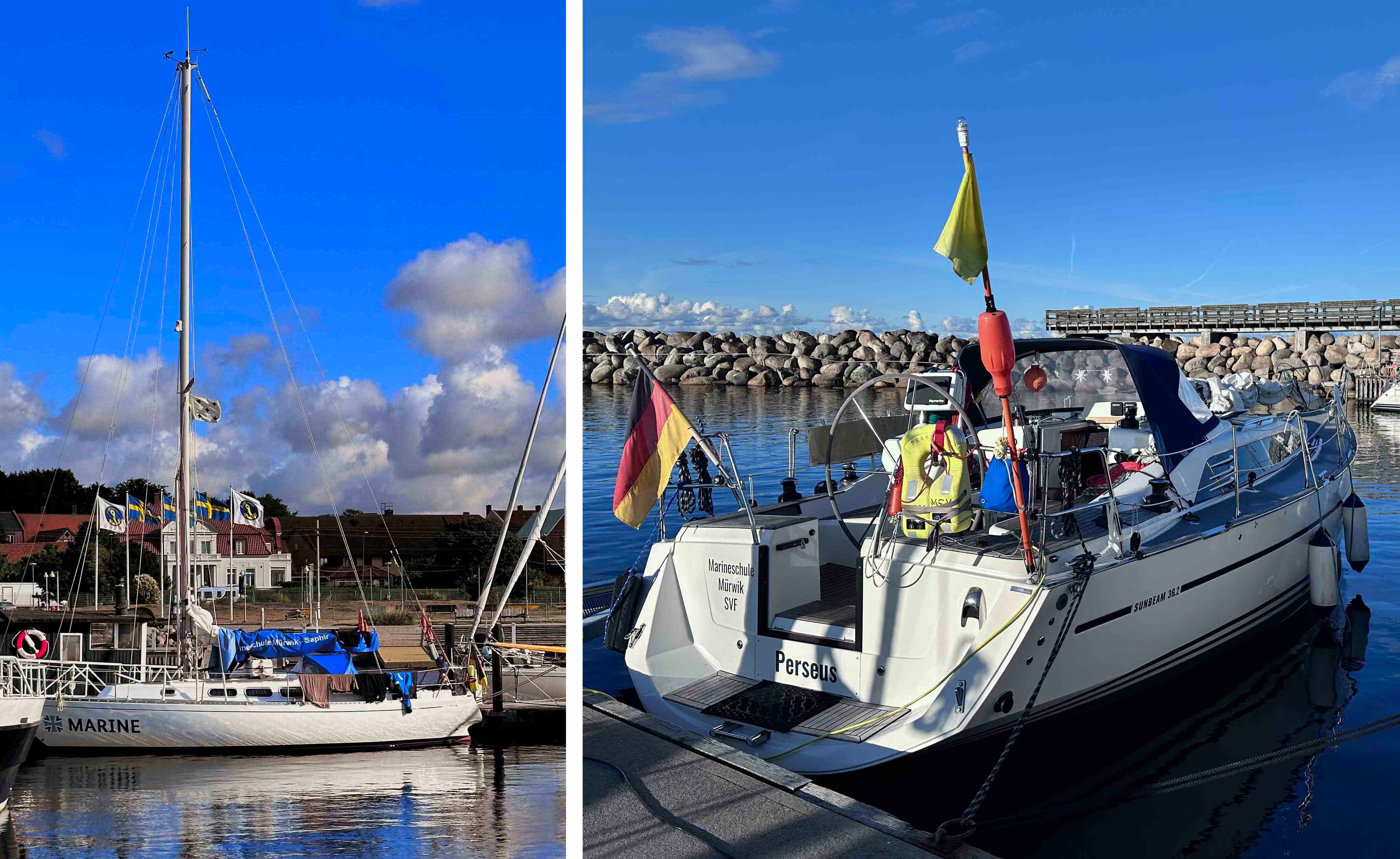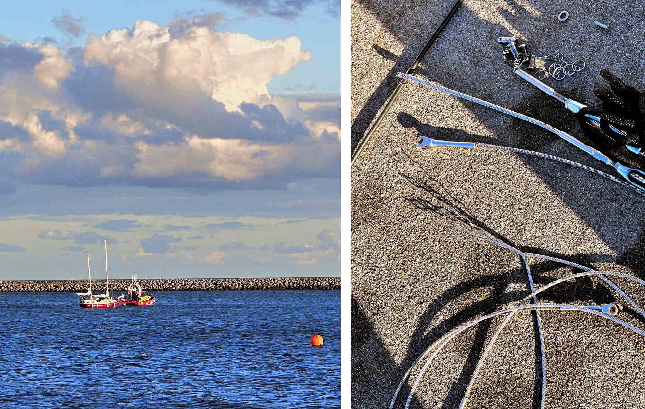 In der Wallanderstadt Ystad (s.o./u.) warten wir und viele andere Yachten auf das Abflauen des Westwindes, der eine Weiterfahrt aktuell ziemlich ungemütlich macht – und abends schon für eine erste Havarie sorgt: eine französische Yacht muss vom hiesigen Seenotsrettungsboot in Schlepp genommen werden (s.u. links). Gegen vier Uhr morgens wecken uns deutsche Kommandorufe und um uns herum legen 8 Segelyachten der Marine mit 7 Masten und 7 funktionsfähigen Rudern an. Sie waren in Leba/Polen aufgebrochen und hatten versucht, die rund 100 Seemeilen Luftlinie nach Rønne/Bornholm gegen ebenjenen Wind aufzukreuzen. Der Hafen Rønne ist jetzt aber geschlossen – die Bornholmer Häfen machen bei starkem Westwind oft dicht –, so dass sie am Ende 200 Seemeilen bis hierher im Kielwasser hatten. Alles stracks gegenan. Die Pinne einer Hanseat 70 und das Want einer Sunbeam 36 (s.u. rechts) waren den Belastungen der Kreuzerei nicht gewachsen; ein komplettes Rigg liegt jetzt am Grund des Bornholmsgat.