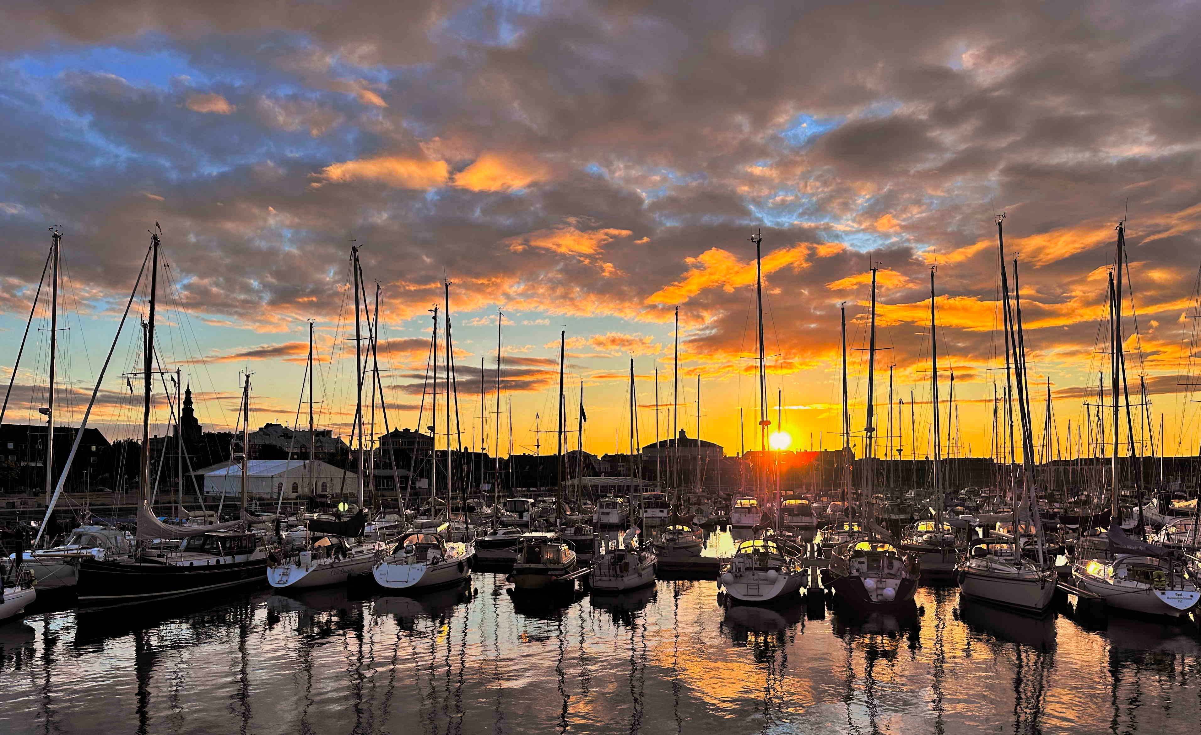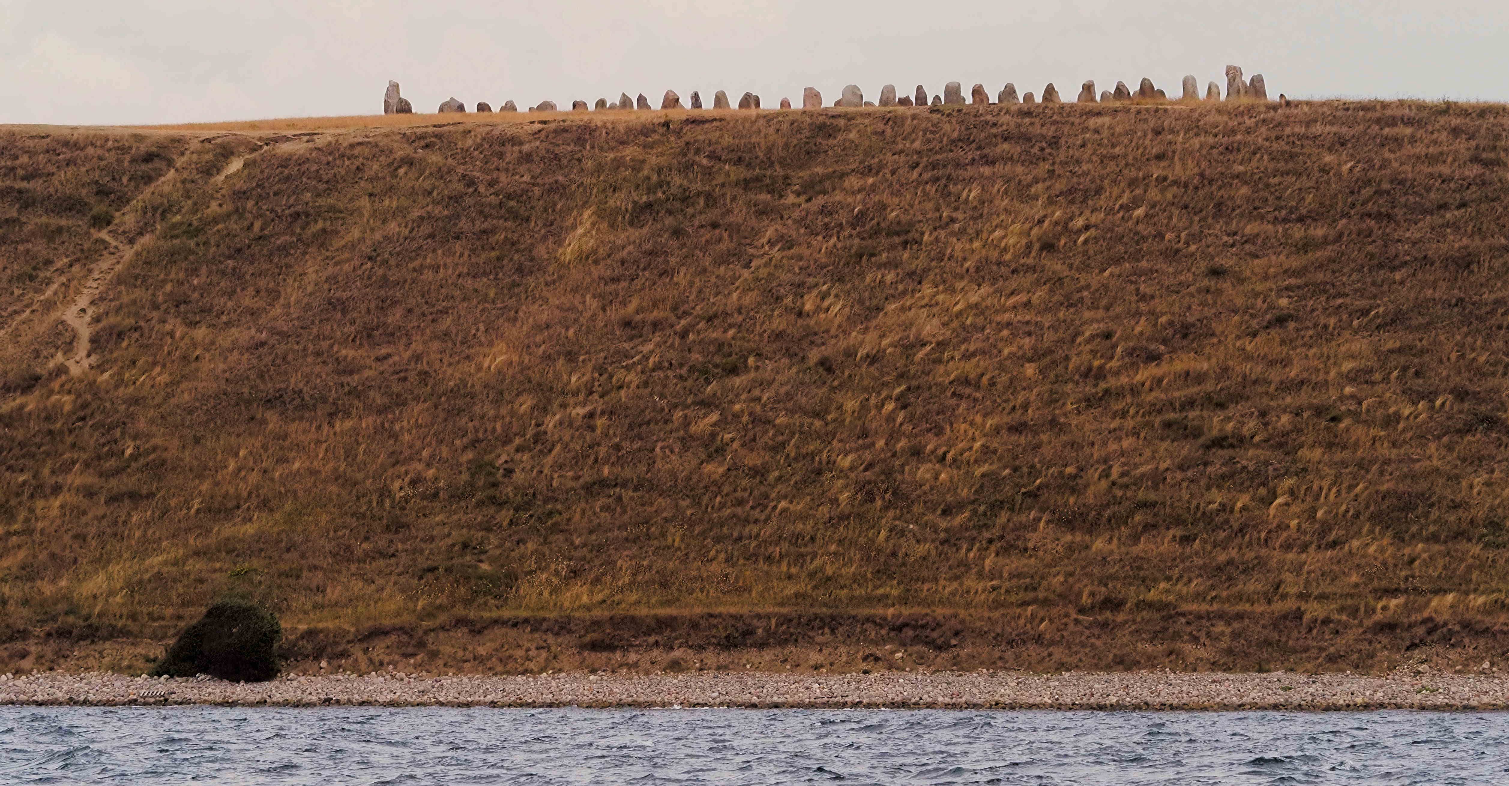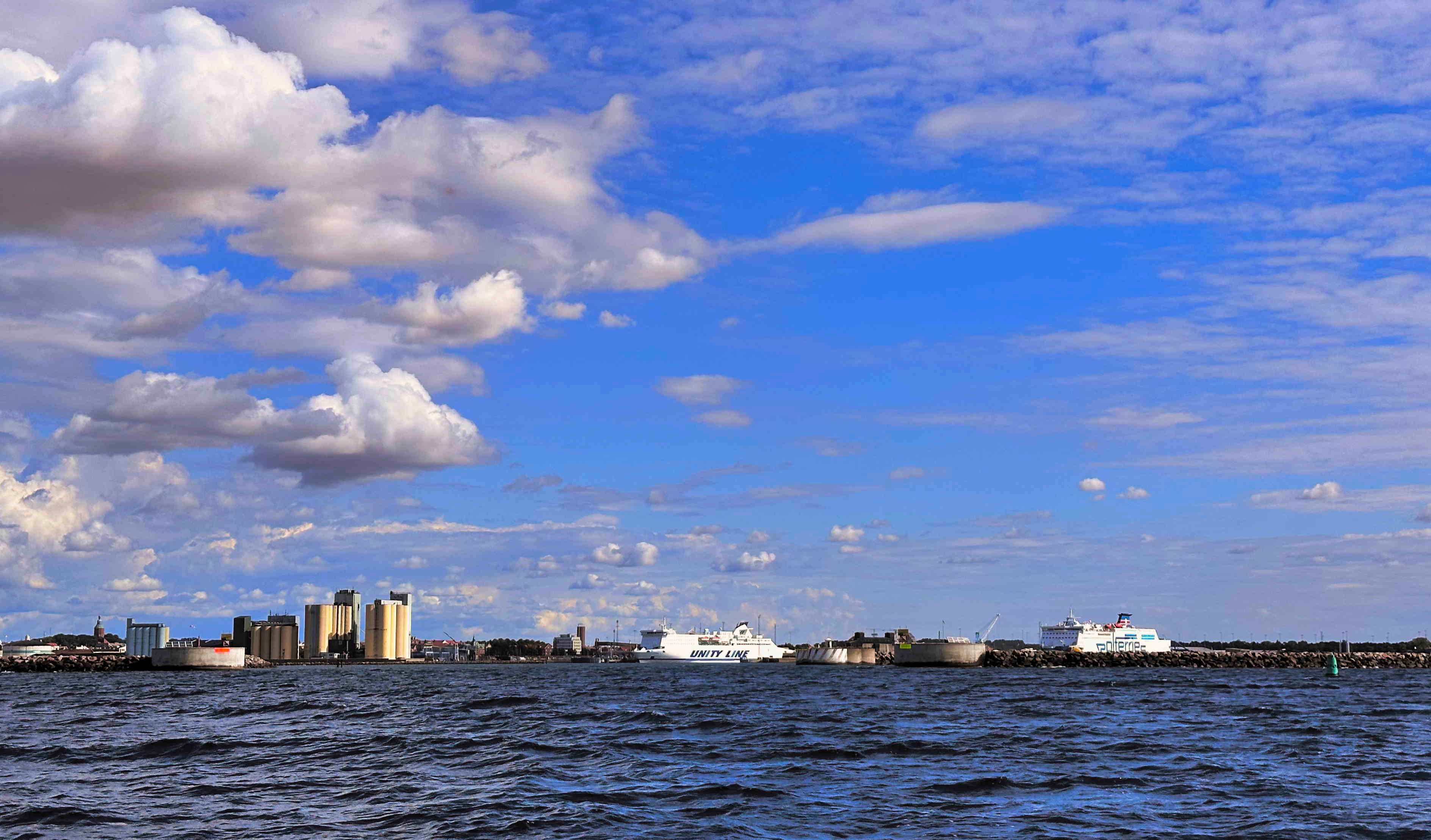 Oben: Unterwegs segeln wir an Ales stenar („Die Steine von Ale“) vorbei, einer der größten Schiffssetzungen – gewissermaßen das Stonehenge – Skandinaviens. 59 bis zu 1,8 Tonnen schwere Steine stehen mit Meerblick an der hier 37 Meter hohen Küste. Warum man um das Jahr 600 diese Hinkelsteine teilweise aus 20km Entfernung hierher schleppte, ist nach wie vor unklar. Unten: Der Hafen von Ystad, wo wir auf den richtigen Wind zur Überquerung der Arkonasee warten .